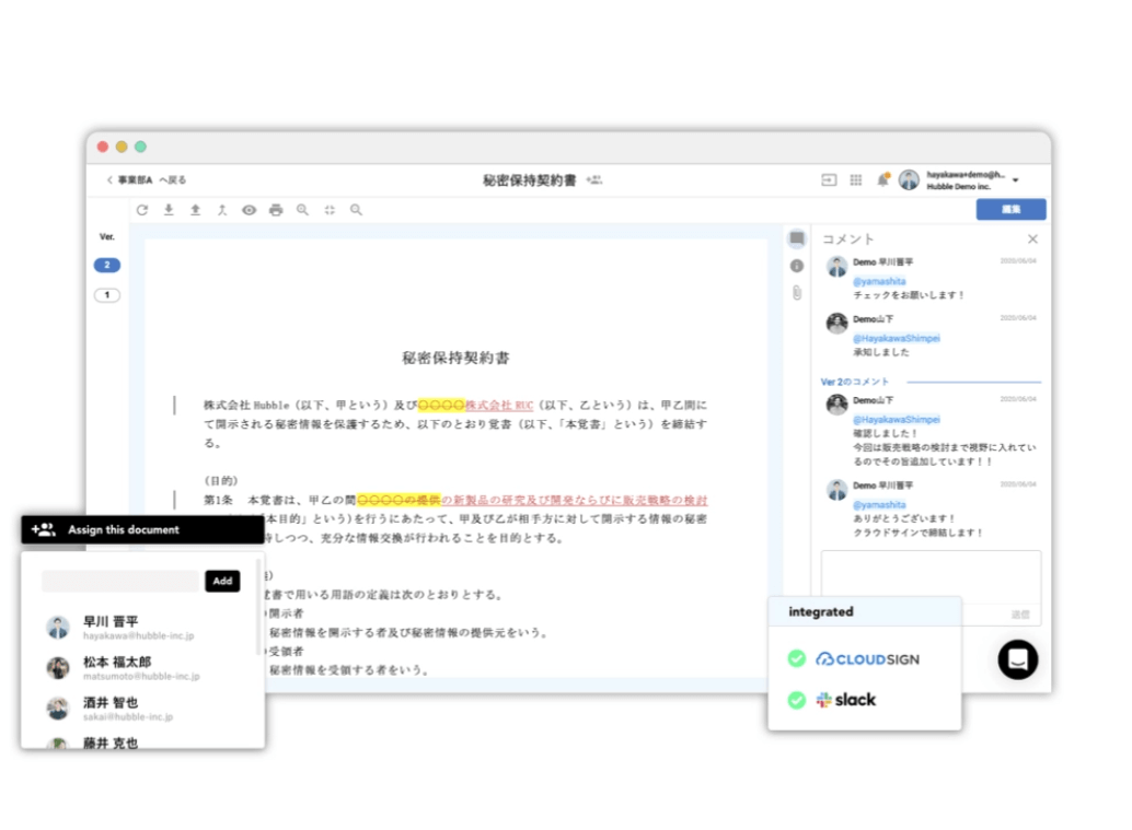Hubbleは、契約書をはじめとする法務ドキュメント業務に特化したクラウド型ソフトウェアを提供しています。Microsoft Wordを利用した書類作成時のバージョンや関連コミュニケーションの管理・共有を効率化し、法務に携わる企業やチームが本当に使いやすいことを考え抜いた無駄のない機能で、業務の生産性を向上をご支援しております。